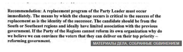 Как отмечалось в отчете, любая критика из уст Януковича не будет услышана по причине неприятия его личности в целом и дискредитации его имиджа в период Оранжевой революции. Манафорт настаивал, что новый лидер Партии регионов не должен ассоциироваться с Януковичем или Кучмой, а в качестве потенциальных кандидатов политтехнолог рекомендовал рассматривать выходцев с юга или юго-востока Украины.