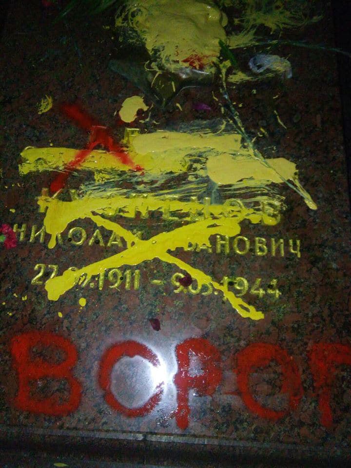 Как сообщала "Страна", в ночь на 21 июня на могиле Кузнецова неизвестные нарисовали желтой краской трезубец, а также написали "враг УПА" и "палач", также трезубец нарисовали на постаменте памятника погибшим солдатам Красной армии.