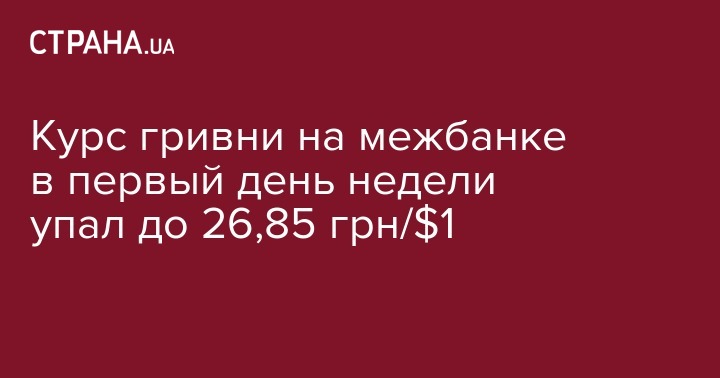 Курс гривни на межбанке в первый день недели упал до 26,85 грн/$1