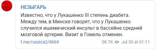 Между тем, популярный политический Telegram-канал "Незыгарь" также сообщал о том, что Лукашенко страдает от сахарного диабета и в целом испытывает большие проблемы со здоровьем. В частности с давлением и ногами. В последнее время белорусский лидер, как сообщали авторы "Незыгаря", "много спит, безмерно ест и работает 4-5 часов в день".