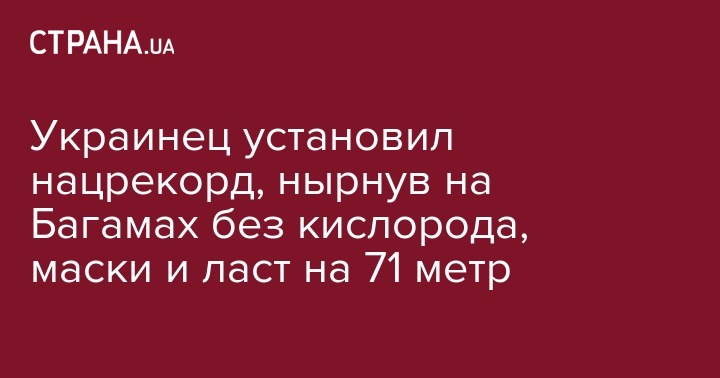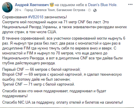 Украинский фридайвер, инструктор и бизнесмен Андрей Хветкевич установил национальный рекорд Украины, погрузившись на 71 метр в Атлантический океан на Багамах не только без кислородного баллона, но и без маски и ласт. Об этом Андрей Хветкевич написал на своей странице в Facebook.