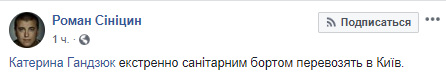 Волонтер Роман Синицын сообщил, что Гандзюк перевели в Киев с помощью санитарного самолета.