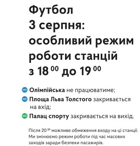 18:00 В день проведения матча метро в Киеве работает в особом режиме. С 18:00 до 19:00 3 августа станция Олимпийская будет закрыта, станции Льва Толстого и Дворец спорта - закрыты на вход. С 20:00 также возможны ограничения на данных станциях.