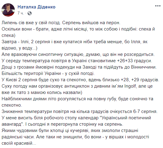 По ее словам, в Ильин день 2 августа температура воздуха в Украине составит +26... +33 градуса. Дожди с грозами вероятные где-то на Западе и подойдут к Винницкой области. Большинство территории Украины окажется в зоне сухой погоды.