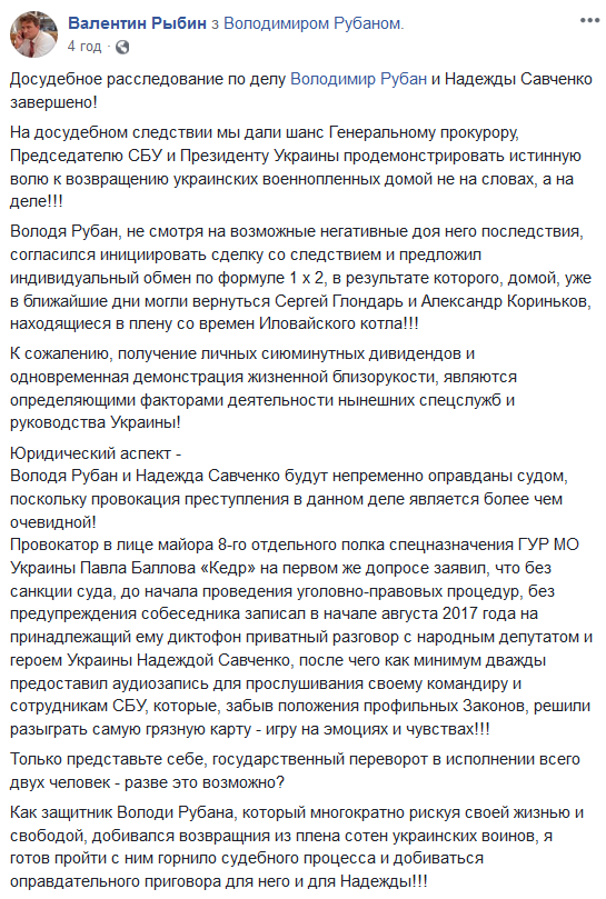 Как защитник Володи Рубана, который многократно рискуя своей жизнью и свободой, добивался возвращния из плена сотен украинских воинов, я готов пройти с ним горнило судебного процесса и добиваться оправдательного приговора для него и для Надежды", - написал Валентин Рыбин.