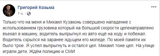Известный одесский активист Григорий Козьма заявил, что на него и еще одного общественника Михаила Кузаконя совершено покушение. По его словам, водитель грузовика ГАЗ целенаправленно въехал в иномарку с активистами, а затем сбежал на мопеде.Об этом Козьма написал на своей странице в Facebook.
