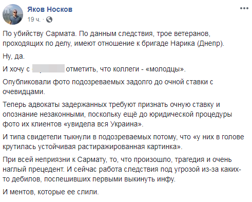 Они заметили, что еще до юридической процедуры опознания фото их клиентов "увидела вся Украина". Об этом написал запорожский журналист Яков Носков.