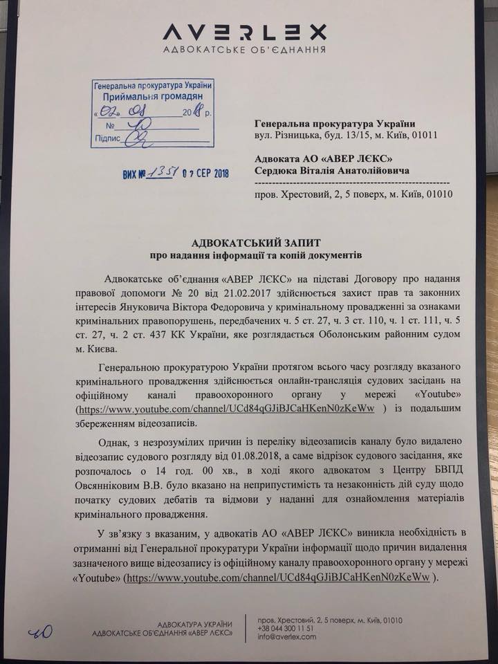 В своем адвокатском запросе Сердюк просит ГПУ объяснить причину удаления видеозаписи с официального канала ГПУ, а также возобновить возможность просмотра именно этой части видеозаписи.