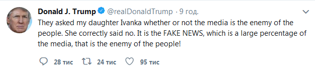 "Они спросили мою дочь Иванку, являются ли средства массовой информации врагами народа. Она правильно ответила, что - "нет". Это фейковые новости, к которым относится большая часть средств массовой информации, то есть враги народа", - написал Дональд Трамп.