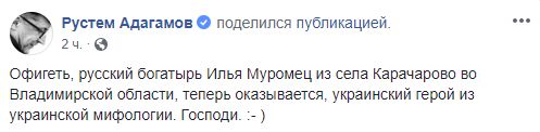 Слова мэра, которые повторили и другие политики, вызвали резонанс в соцсетях. В России уже возмутились, что Украина "присвоила" себе русского богатыря. Известный блогер Рустем Адагамов написал в Facebook: "Офигеть, русский богатырь Илья Муромец из села Карачарово во Владимирской области, теперь оказывается, украинский герой из украинской мифологии. Господи".