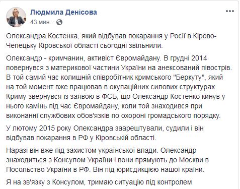 "Александра Костенко, который отбывал наказание в России в Кирово-Чепецке Кировской области, сегодня освободили.…Сейчас он уже под защитой украинской власти. Александр находится с консулом Украины, и они направляются в Москву в посольство Украины в РФ. Он под юрисдикцией нашей страны", - написала украинский омбудсмен.