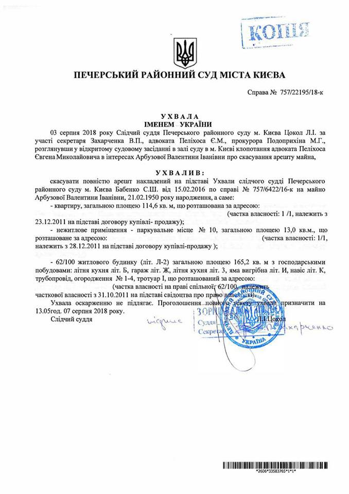 Печерский суд Киева принял решение, что Генеральная прокуратура Украины, не имея на то оснований, арестовала имущество матери бывшего первого вице-премьера Сергея Арбузова.