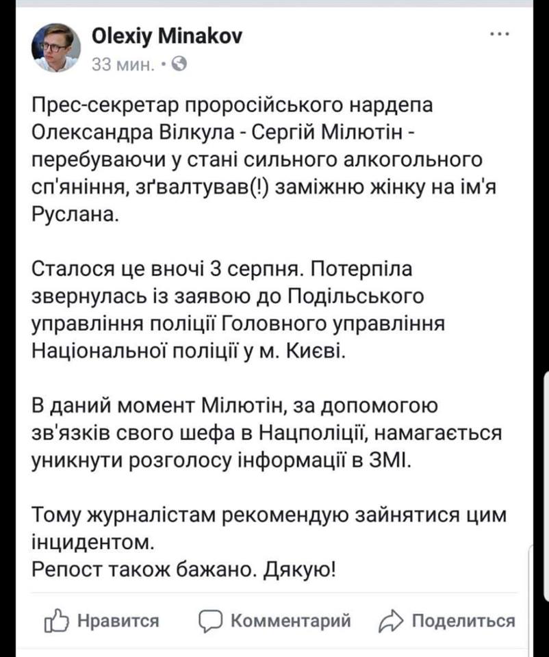 Блогер Алексей Минаков опубликовал в Facebook информацию, что пресс-секретарь нардепа Александра Вилкула Сергей Милютин изнасиловал замужнюю женщину по имени Руслана будучи в состоянии алкогольного опьянения. Якобы женщина уже подала заявление в Подольское райуправление полиции.