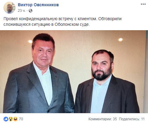 Виктор Овсянников, адвокат беглого экс-президента Виктора Януковича, которого Оболонский суд уже намерен заменить, встретился со своим подзащитным в России. После этой встречи он в Facebook обнародовал свежую фотографию Януковича .