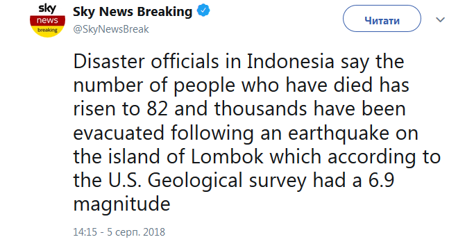 Национальное агентство по борьбе со стихийными бедствиями в Индонезии заявило о том, что в результате землетрясения на острове Ломбок погибли не менее 82 человек. Об этом сообщает Sky News в своем Twitter.