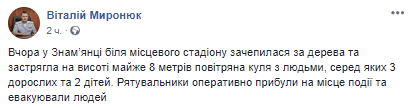 "Вчера в Знаменке, возле местного стадиона, зацепился за деревья и застрял на высоте почти восемь метров воздушный шар с людьми, среди которых трое взрослых и двое детей", - написал в соцсети Миронюк.