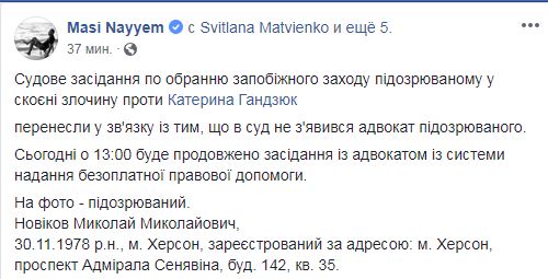 Фото нападавшего опубликовал юрист Маси Найем в своем Facebook. Он также написал, что подозреваемого зовут Николай Новиков, ему 40 лет. Он добавил, что заседание суда по избранию меры пресечения Новикову перенесли из-за неявки адвоката задержанного.