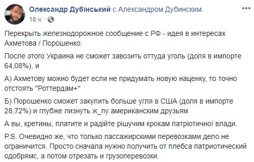 Журналист Александр Дубинский объясняет, кому это выгодно: "Перекрыть железнодорожное сообщение с РФ - идея в интересах Ахметова / Порошенко. После этого Украина не сможет завозить оттуда уголь (доля в импорте 64,08%), и А) Ахметову можно будет если не придумать новую наценку, то точно отстоять "Роттердам+"