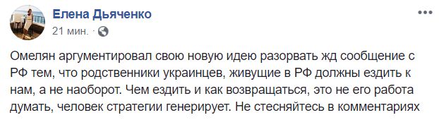 В социальных сетях уже отреагировали на слова министра. Политический эксперт Елена Дьяченко написала: "Омелян аргументировал свою новую идею разорвать жд сообщение с РФ тем, что родственники украинцев, живущие в РФ должны ездить к нам, а не наоборот. Чем ездить и как возвращаться, это не его работа думать, человек стратегии генерирует".