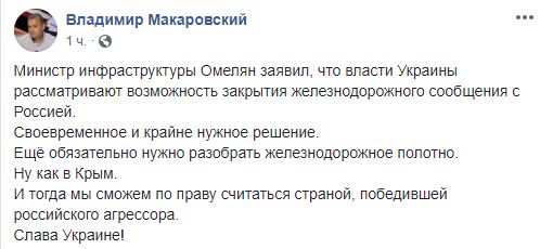 Политконсультант Владимир Макаровский с иронией предлагает для верности разобрать рельсы: "Министр инфраструктуры Омелян заявил, что власти Украины рассматривают возможность закрытия железнодорожного сообщения с Россией. Своевременное и крайне нужное решение. Ещё обязательно нужно разобрать железнодорожное полотно. Ну как в Крым. И тогда мы сможем по праву считаться страной, победившей российского агрессора. Слава Украине!"