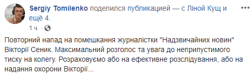 Глава Национального союза журналистов Украины Сегей Томиленко написал, что в НСЖУ ждут эффективного расследования и предоставления охраны журналистке.