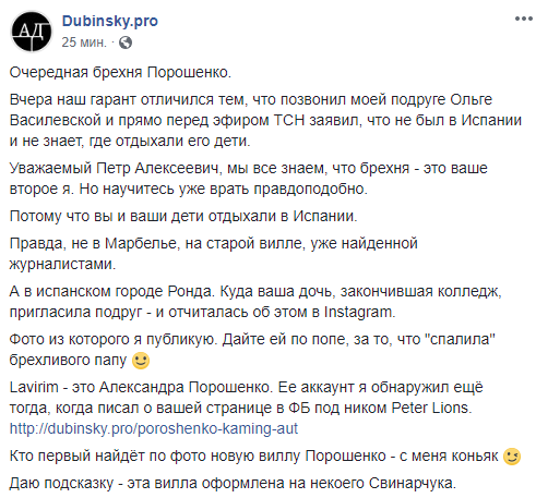 "Очередная брехня Порошенко. Вчера наш гарант отличился тем, что позвонил моей подруге Ольге Василевской и прямо перед эфиром ТСН заявил, что не был в Испании и не знает, где отдыхали его дети. Уважаемый Петр Алексеевич, мы все знаем, что брехня - это ваше второе я. Но научитесь уже врать правдоподобно. Потому что вы и ваши дети отдыхали в Испании", - сообщается на странице журналиста.