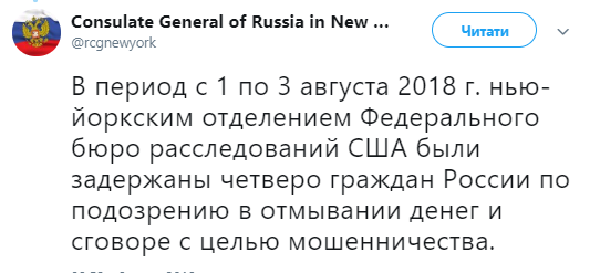 Генконсульство России в Нью-Йорке уточнило в Twitter, что они были задержаны "в период с 1 по 3 августа". В то же время в диппредставительстве заявили, что один из россиян был арестован не в Лос-Анджелесе, а в бостонском аэропорту "в момент посадки на самолет в Цюрих". По словам генконсульства, он уже доставлен в федеральную тюрьму в Нью-Йорке.