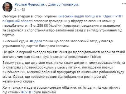 "Сегодня впервые в истории Украины Киевский отдел полиции в г. Одессе ГУ НП в Одесской области объявил гражданину подозрение за совершение преступления, предусмотренного ч. 3 ст. 299 УК Украины (жестокое обращение с животными), и обратился с ходатайством о мере пресечения в виде содержания под стражей", - отметил он.