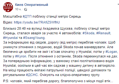 Масштабное ДТП с участием четырех авто произошло в Киеве возле станции метро Сырец поздно вечером 7 августа. Об этом сообщает "Киев Оперативный".