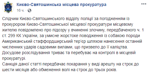 "Местному жителю сообщили о подозрении в совершении преступления, предусмотренного ч. 1 ст. 299 (Жестокое обращение с животными) Уголовного кодекса Украины, за умышленное жестокое обращение с собакой породы американский стаффордширский терьер путем нанесения ей многочисленных ударов садовыми вилами, собака получила увечья", - говорится в опубликованном сообщении.