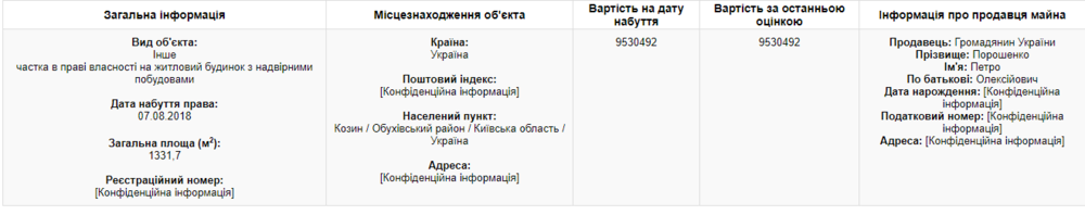 Согласно декларации Петра Порошенко за 2017 год, 100% дома в Козине принадлежали ему. В декларации главы государства указывалось, что стоимость дома на момент приобретения составляла 30 миллионов гривен.