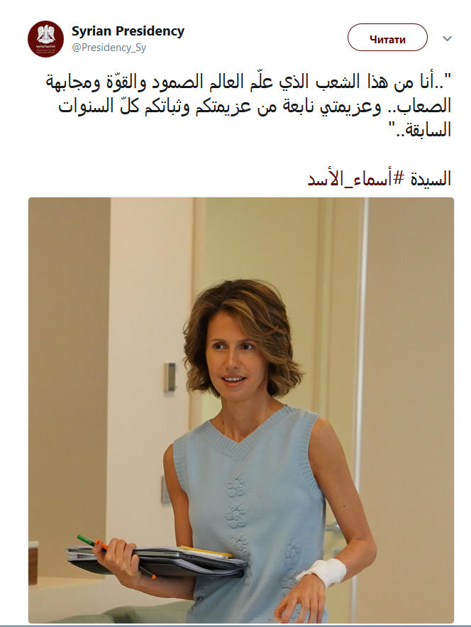Ранее в канцелярии президента Сирии сообщили, что заболевание диагностировано на ранней стадии, и что супруга сирийского президента уже приступила к лечению. На официальном фото из Twitter видно повязку на левой руке, которая, вероятно скрывает, следы от внутривенных инъекций.