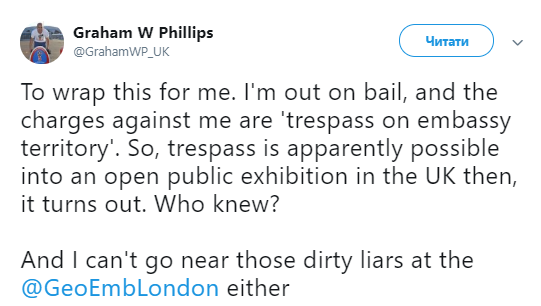 "Меня выпустили под залог, а обвинения против меня - незаконное проникновение на территорию посольства... Также мне запретили приближаться к этим грязным лжецам из посольства Грузии в Великобритании", - написал Филлипс в своем Twitter.