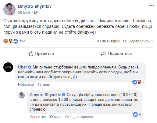 Шимкив отметил, что полиция уже занимается делом. На сообщение уже отреагировала компания Uber, которая обратилась к чиновнику с просьбой сообщить детали инцидента.