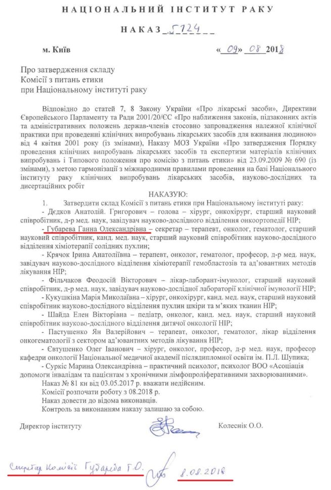 Губарева новоназначена секретарем Комиссии по вопросам этики при национальном Институте рака. Также она отвечает за согласование проведения клинических испытаний в Институте.