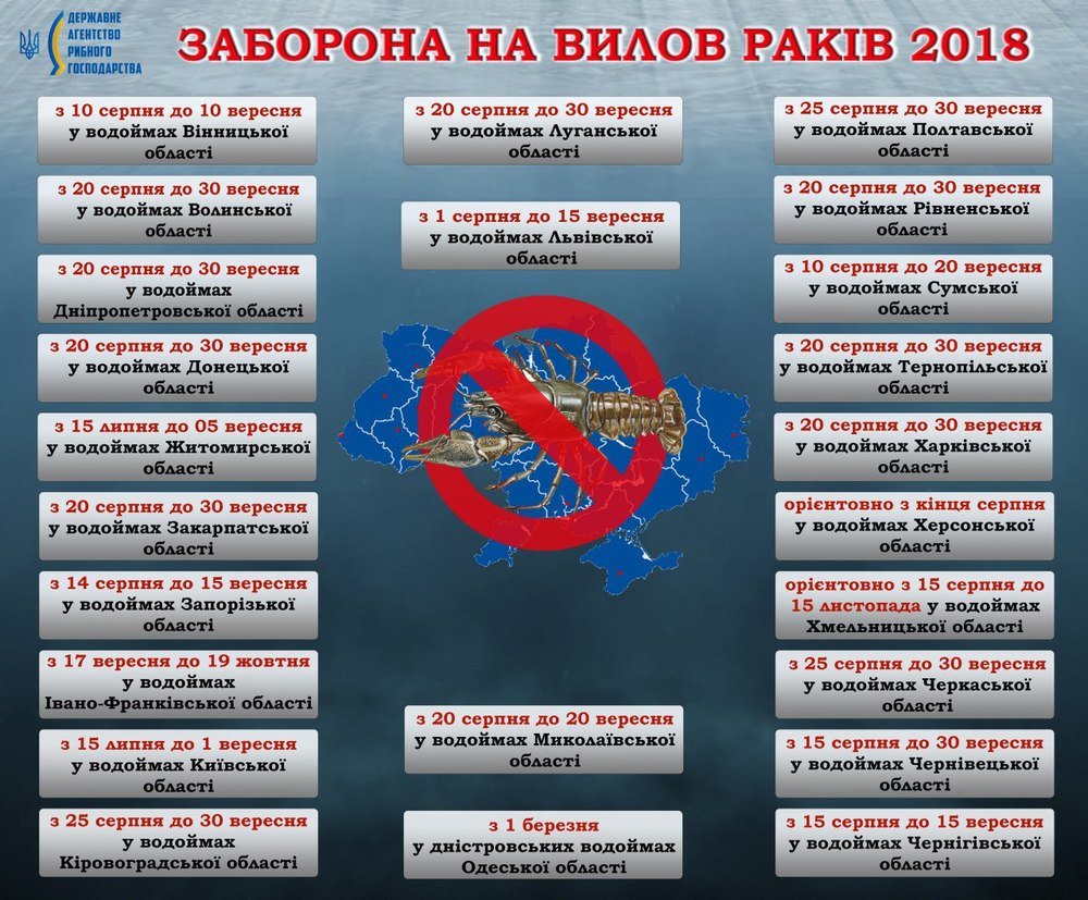 "Это (временный запрет на вылов - Прим.Ред.) связано с тем, что в этот период раки меняют свой хитиновый покров на новый, иными словами линяют. В это время они особенно нуждаются в усиленном питании и поэтому бросаются на любую наживку, что существенно облегчает их вылов. На территории Днепропетровской области во всех водоемах, включая и места их разведения для вылова, ловля этих речных обитателей категорически запрещена с 20 августа по 30 сентября включительно", - рассказал начальник управления Государственного агентства рыбного хозяйства Украины в Днепропетровской области Василий Волков.