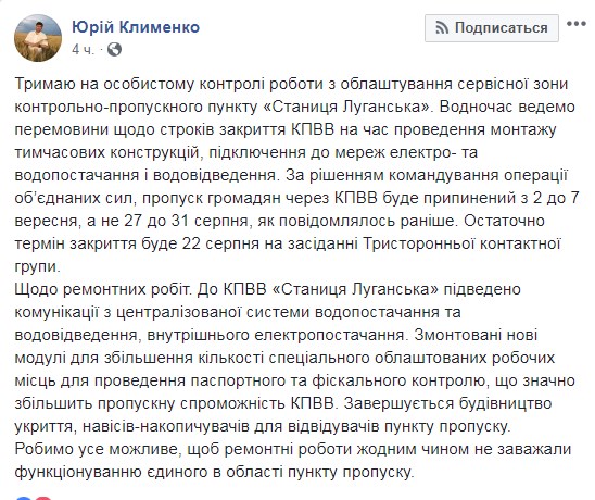 "Держу на личном контроле работы по обустройству сервисной зоны контрольно-пропускного пункта "Станица Луганская". В то же время ведем переговоры о сроках закрытия КПВВ на время проведения монтажа временных конструкций, подключения к сетям электро- и водоснабжения и водоотведения. По решению командования операции объединенных сил, пропуск граждан через КПВВ будет приостановлен с 2 до 7 сентября…", - написал он.