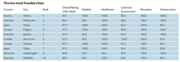 На первом месте в списке расположилась столица Австрии Вена, на втором - город Мельбурн в Австралии, третье место занял японский город Осака. Замыкают первую пятерку Калгари (Канада) и австралийский Сидней.
