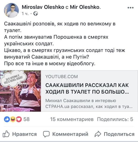 Любопытно, что из всего интервью с бывшим президентом Грузии и губернатором Одесской области  блогеров, лояльных к президенту, зацепило именно это откровение Саакашвили - про походы в туалет.