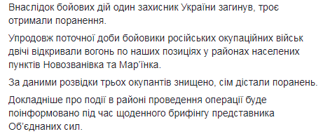 "В результате боевых действий один защитник Украины погиб, трое получили ранения", - сообщили в штабе.
