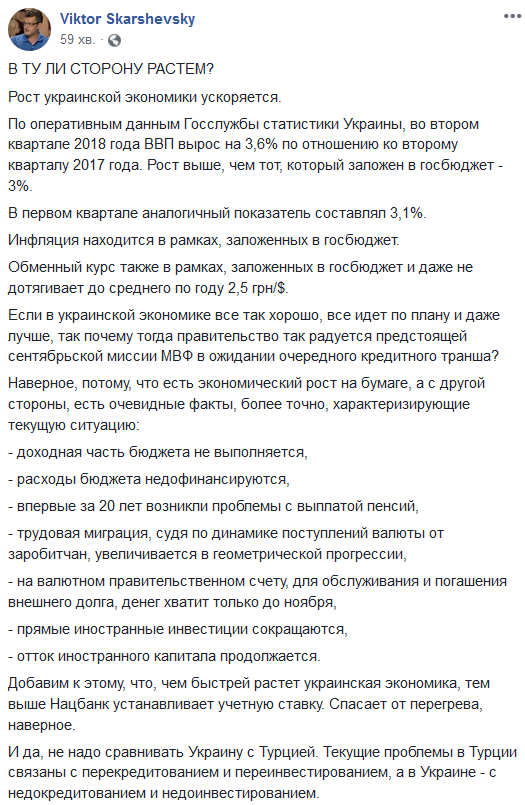 "По оперативным данным Госслужбы статистики Украины, во втором квартале 2018 года ВВП вырос на 3,6% по отношению ко второму кварталу 2017 года. Рост выше, чем тот, который заложен в госбюджет - 3%, - пишет экономист Виктор Скаршевский. - В первом квартале аналогичный показатель составлял 3,1%. Инфляция находится в рамках, заложенных в госбюджет.