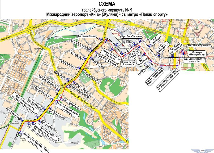 Теперь, начиная с субботы, троллейбус №9 будет курсировать по схеме: Международный аэропорт "Киев" имени Игоря Сикорского - проспект Воздухофлотский - улица Смелянская - улица Народного Ополчения (в обратном направлении проспект Воздухофлотский) - Севастопольская площадь - Воздухофлотский проспект - улица Ивана Огиенко - улица Георгия Кирпы (в обратном направлении улица Ползунова) - улица Василия Липкивского - улица Льва Толстого - улица Жилянская (в обратном направлении улица Саксаганского) - улица Шота Руставели- улица Рогнединская - улица Эспланадная -– станция метро "Дворец спорта" .