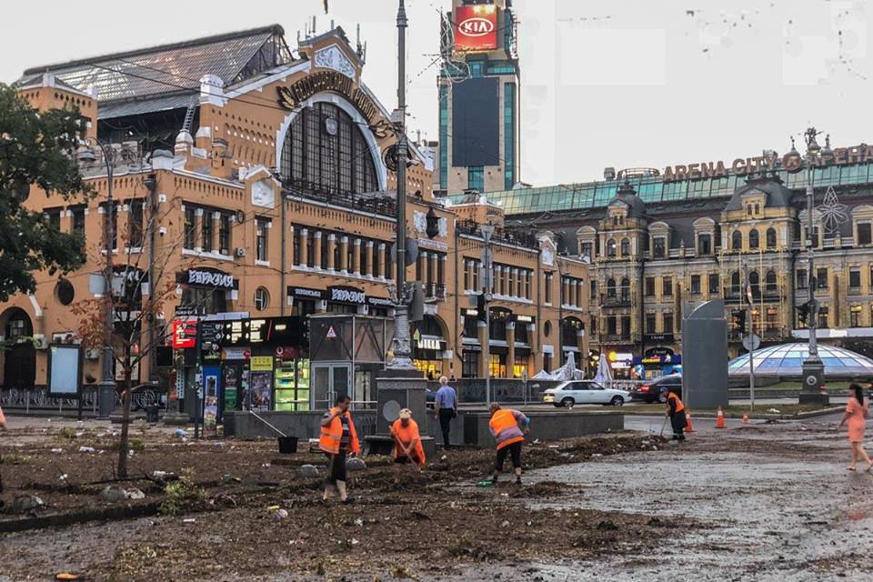 Крещатик на время ливня превратился в бурлящую реку. Когда вода схлынула, на дороге остались горы мусора, которые с утра принялись убирать коммунальщики. Они достают листья и ветки из ливневок. У многих деревьев сломаны ветки.
