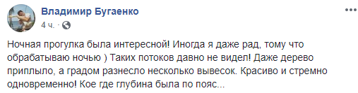 "Ночная прогулка была интересной! Иногда я даже рад, тому что обрабатываю ночью. Таких потоков давно не видел! Даже дерево приплыло, а градом разнесло несколько вывесок. Красиво и стремно одновременно! Кое-где глубина была по пояс", - написал фотограф Владимир Бугаенко.