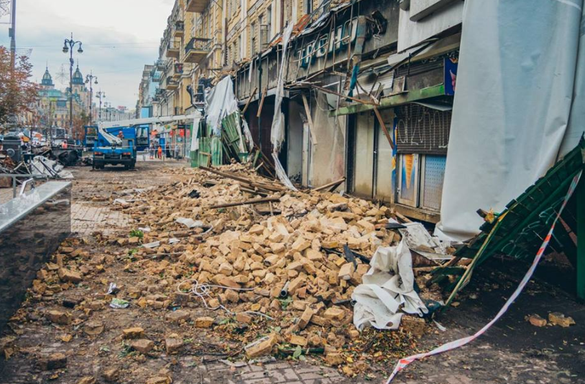 Также мы писали, что в самом центре Киева, 16 августа, произошло очередное ЧП. Здесь, на Крещатике, напротив центрального универмага, обрушилась часть горевшего ранее здания, фасад которого был скрыт защитной сеткой.