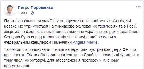 Порошенко напомнил Меркель об украинских заложниках и политических заключенных, которые содержатся в России и на неподконтрольных территориях, и подчеркнул необходимость срочного освобождения Олега Сенцова, который продолжает голодовку.