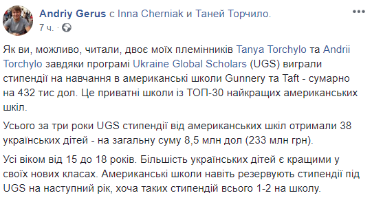 Как рассказал Андрей Герус, двое его племянников Татьяна и Андрей Торчило выиграли стипендии на обучение в американские школы Gunnery та Taft по программе организации Ukraine Global Scholars (UGS).