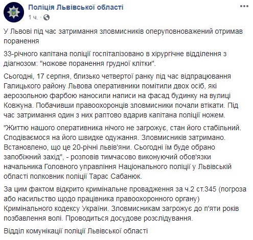 Инцидент произошел 17 августа. Во Львове уличные "художники"-националисты ударили ножом 33-летнего капитана полиции. В полиции сообщили, что оперативники заметили двух парней, которые наносили надпись на фасад дома. Увидев полицейских, молодые люди начали убегать. А во время задержания один из них подрезал ножом капитана полиции. Полицейский остался жив, он находится в больнице. Оба "художника" были задержаны.