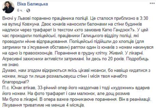 Как отметила журналист НТН Вика Балицкая, полицейский находится в реанимации. У него тяжелое проникающее ранение. Лечение будет длиться не менее 4 месяцев. По ее словам, полицейские подошли, чтобы задержать граффитчиков и выяснить обстоятельства, когда один из националистов выхватил нож и ударил в грудную клетку полицейского.