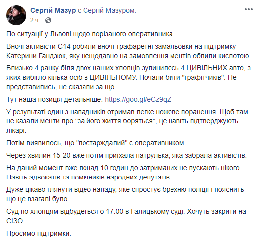 "Около 4 утра у двух наших ребят остановилось 4 гражданских авто, из которых выбежали несколько человек в гражданском. Начали бить "граффитчиков". Не представились, не сказали за что... В результате один из нападавших получил легкое ножевое ранение. Чтобы там не говорили менты о "при его жизни борются", это даже подтверждают врачи. Потом оказалось, что "постарждалий" является оперативником. Через минут 15-20 уже потом приехала патрулька, которая забрала активистов", - написал он.